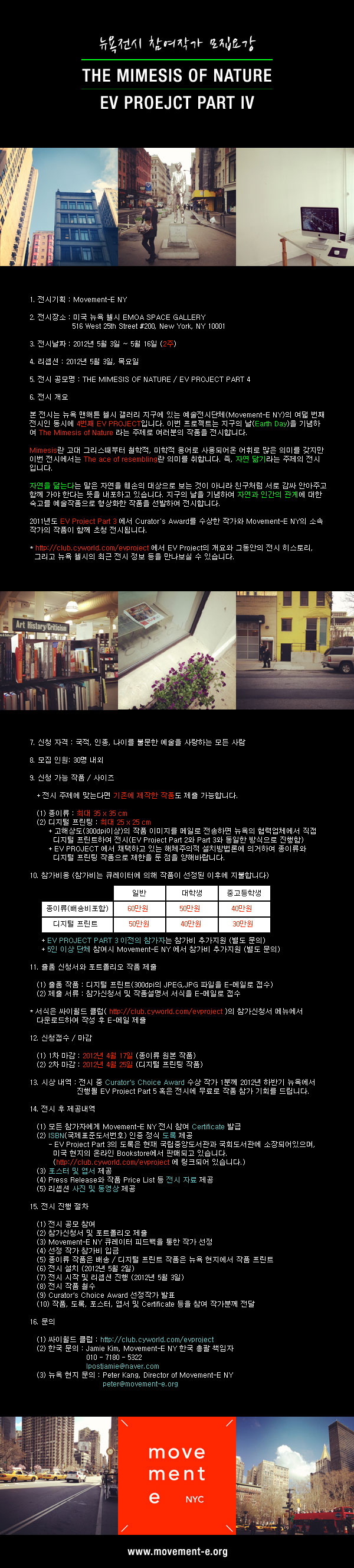본 전시는 뉴욕 맨해튼 첼시 갤러리 지구에 있는 예술전시단체(Movement-E NY)의 여덟 번째 전시인 동시에 4번째 EV PROJECT입니다. 이번 프로젝트는 지구의 날(Earth Day)을 기념하여 The Mimesis of Nature 라는 주제로 여러분의 작품을 전시합니다.