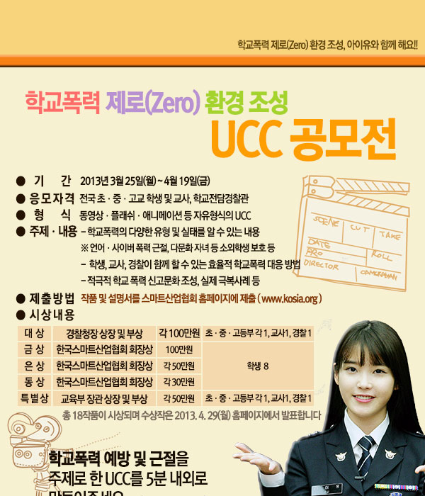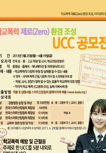 한국스마트산업협회가 주관하고, 경찰청이 주최하는 ' 학교폭력 제로(Zero) 환경 조성' UCC 공모전이 개최됩니다. 심각한 사회적 문제로 자리잡은 학교폭력에 대한 근원적인 해결책은 관심과 사랑이라는 것을 강조하며 한국스마트산업협회는 작년에 이어 UCC 공모전을 시작합니다.