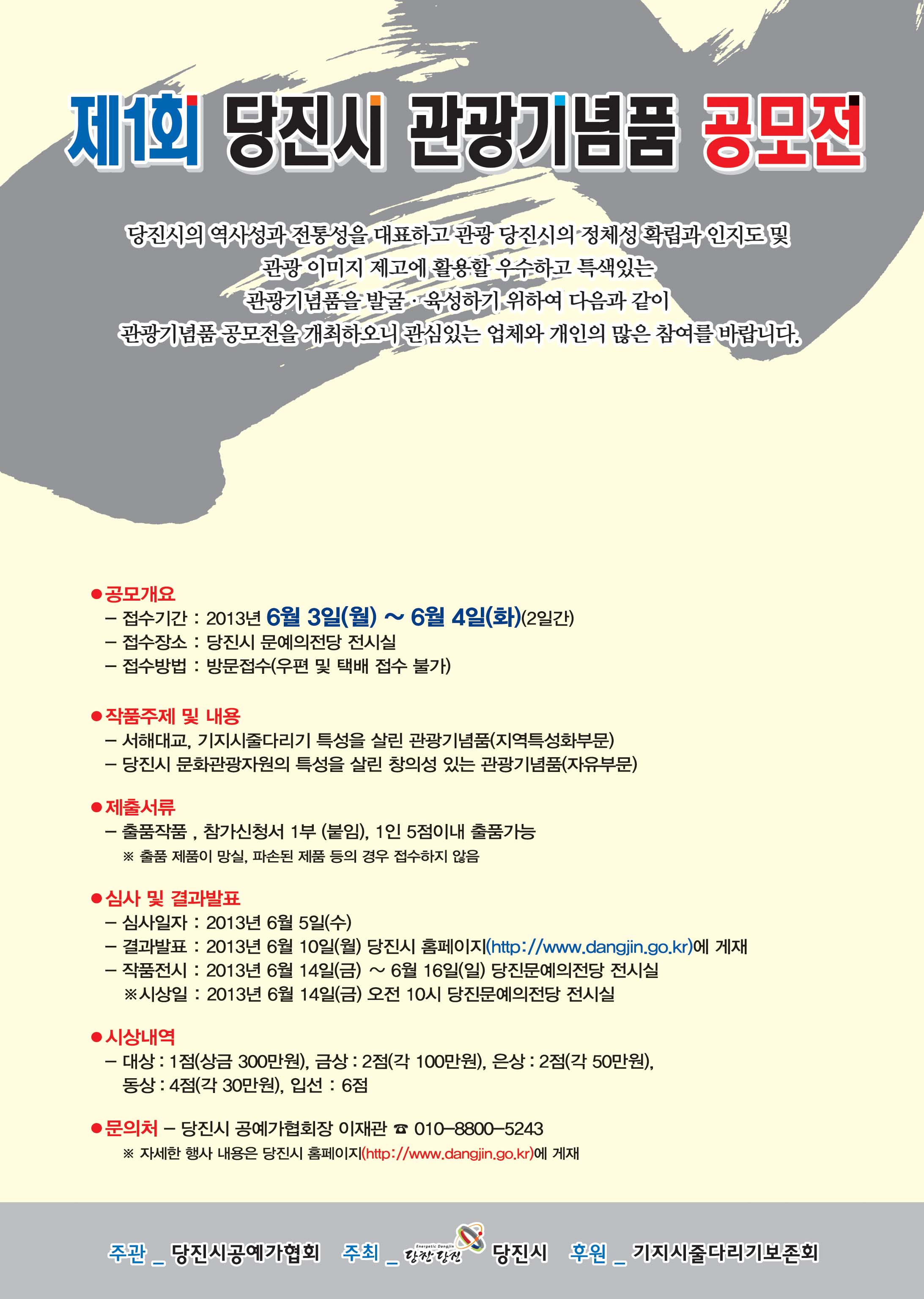 - 당진시의 역사성과 전통성을 대표하고 관광 당진시의 정체성 확립과 인지도 및 관광 이미지 제고에 활용할 우수하고 특색있는 관광기념품을 발굴, 육성하기 위하여 다음과 같이 관광기념품 공모전을 개최하오니 관심있는 업체와 개인의 많은 참여 바랍니다.