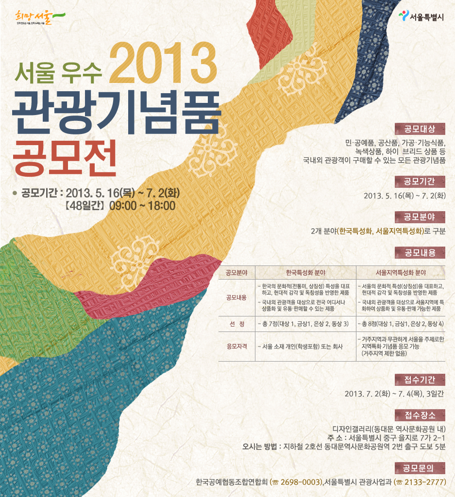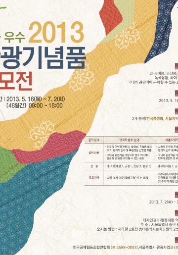 수요자 중심의 우수 관광기념품을 개발하여 한국 및 서울의 관광매력을 제고하고자 「2013 서울우수관광기념품 공모전」을 다음과 같이 개최하오니 많은 참여를 바랍니다.
