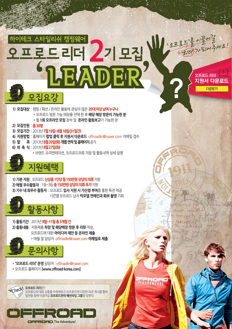 - 오프로드의 대표 상품을 착장해보고 오프로드에 다양한 의견 제시를 통해 발전을 함께 이끌어갈 오프로드만의 대학생 패션 리딩 그룹을 말합니다