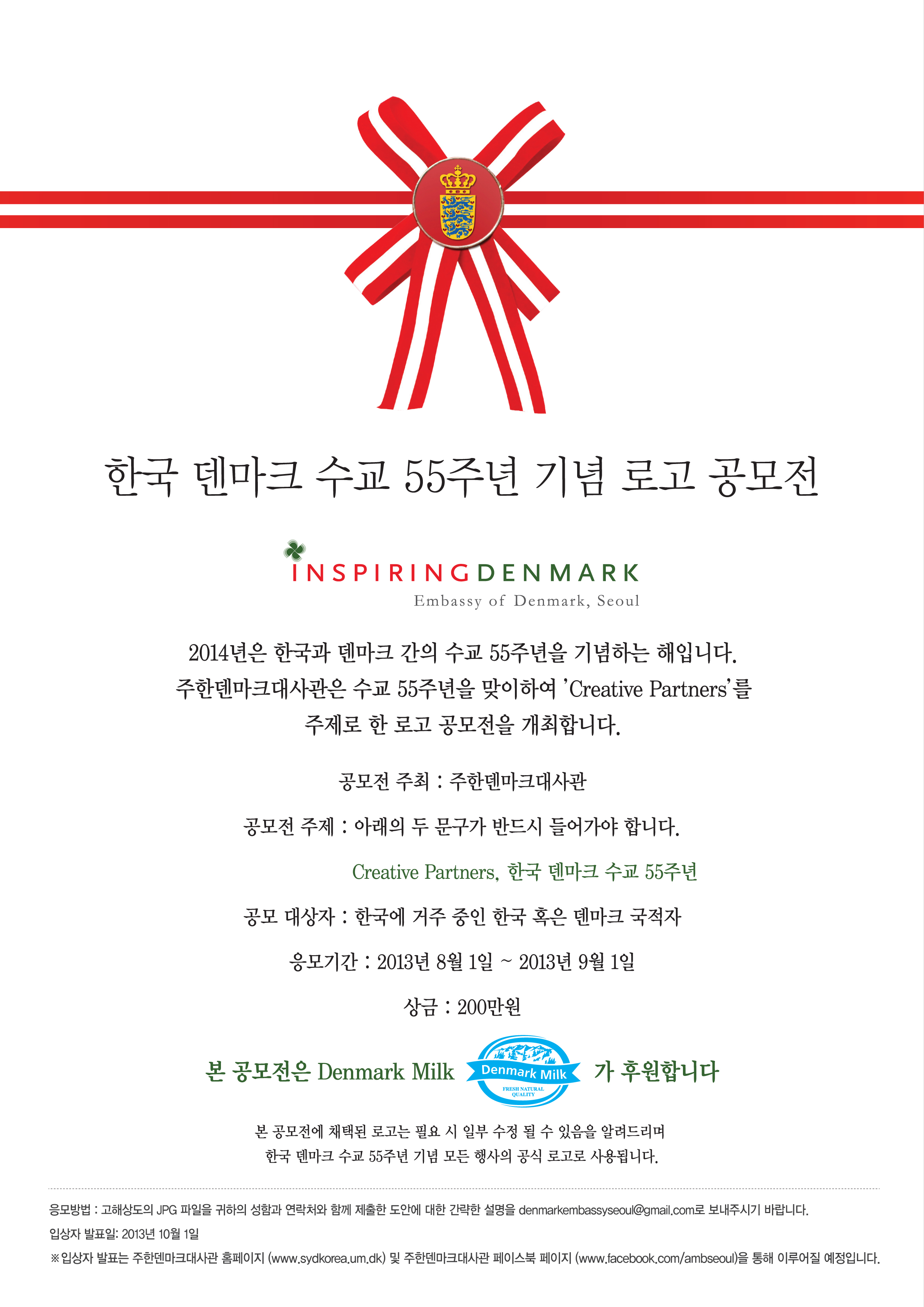 - 주한 덴마크 대사관이 한국 덴마크 수교 55주년 기념 로고 공모전을 개최합니다. 본 공모전에 채택된 로고는 2014년에 열릴 모든 한국 덴마크 수교 55주년 기념 행사의 공식 로고로 사용됩니다. 본 공모전은 Denmark Milk가 후원하며 채택 로고는 Denmark Milk 우유팩에도 쓰일 예정입니다.