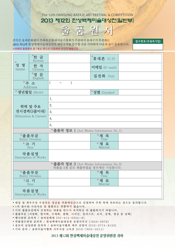 - 한성백제미술대상전 운영사무국 (우)138-851 서울 송파구 송파1동 111-19번지 2층