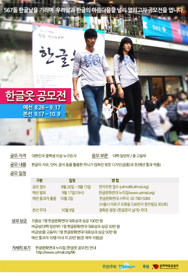 - 시상한 디자인과 한글 옷의 저작권은 당선자에 있으면 한글문화연대는 인쇄, 제작, 배포 권한을 가집니다.