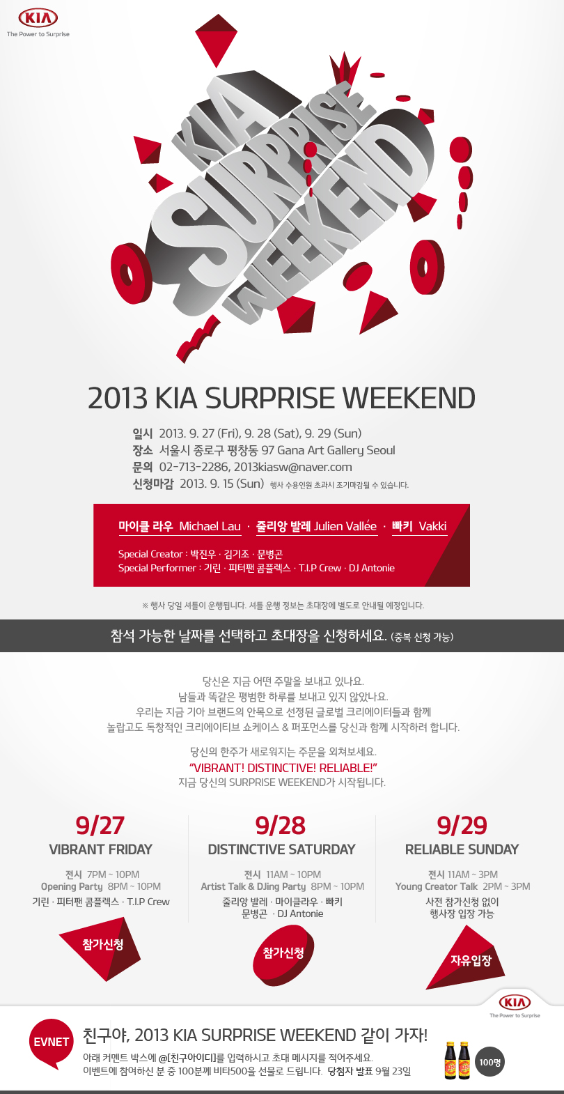 - 기아자동차에서 글로벌 크리에이터들과 함께 놀랍고도 독창적인 크리에이티브 쇼케이스 & 퍼포먼스 파티인 2013 서프라이즈위크엔드를 개최합니다. 서프라이즈위크엔드에는 세계적으로 유명한 아티스트분들이 같이 참석합니다. 기아 2013 서프라이즈위크엔드 파티에 참석해주실 메인 아티스트는 빠키(VVAKI), 줄리앙 발레(Julien Vallee), 마이클 라우(Michael Lau)입니다.