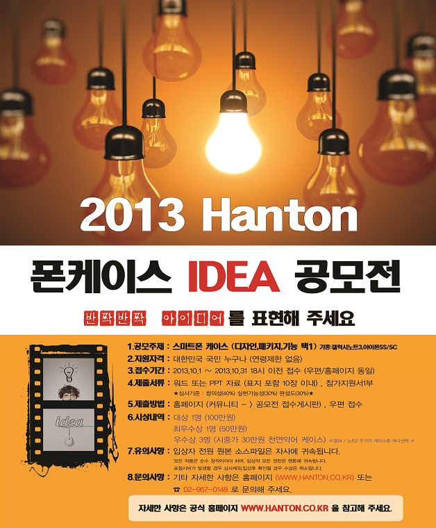 - 홈페이지 접수 : http://www.hanton.co.kr/ -> 커뮤니티 -> 아이디어 공모전 ->
