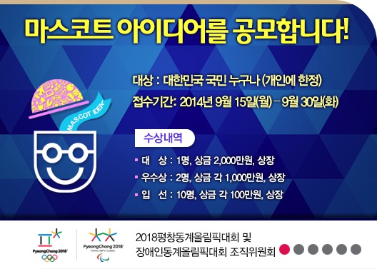- 동계올림픽 및 장애인동계올림픽 마스코트 아이디어 (명칭, 디자인, 스토리텔링 포함)