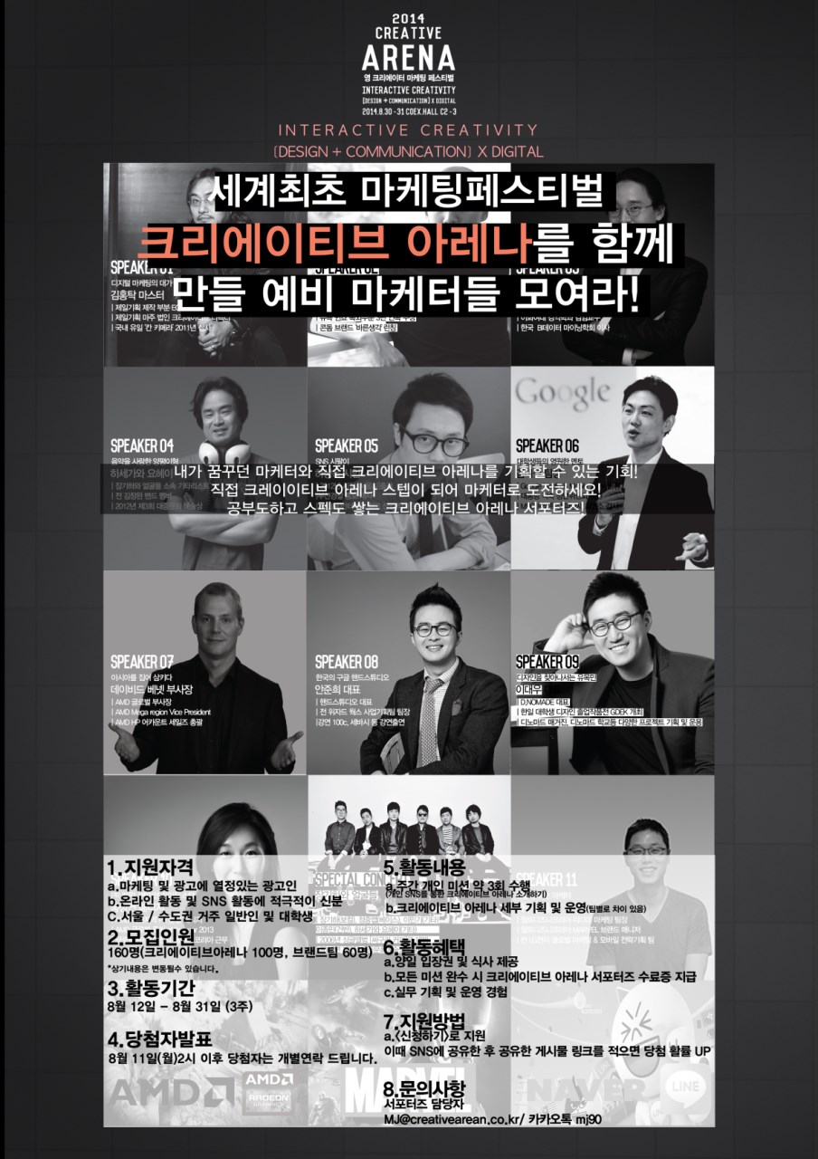 내가 꿈꾸던 마케터와 직접 크리에이티브 아레나를 기획할 수 있는 기회! 직접 크리에이티브 아레나 스텝이 되어 예비 마케터로 도전하세요! 크리에이티브 아레나 서포터즈로 활동하시면 다양한 실무경험과 동시에 국내외 최고의 연사들의 강연을 들으실 수 있습니다. 공부하고 스펙도 쌓는 일석이조 크리에이티브 아레나 서포터즈!!