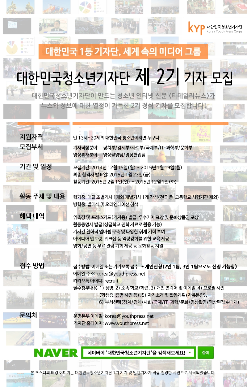- 대한민국청소년기자단이 만드는 청소년 인터넷 신문 <티데일리뉴스>가 뉴스와 정보에 대한 열정이 가득한 2기 정식 기자를 모집합니다!