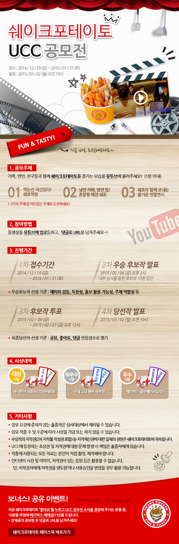 * 보너스 이벤트 지금 쉐이크포테이토 좋아요를 누르고 UCC 공모전 소식을 공유해 주시는 분들 중, 다섯분을 추첨해 메가박스 예매권(1인)을 드립니다. 전체공개 스크랩한 후 댓글로 URL을 남겨주세요!