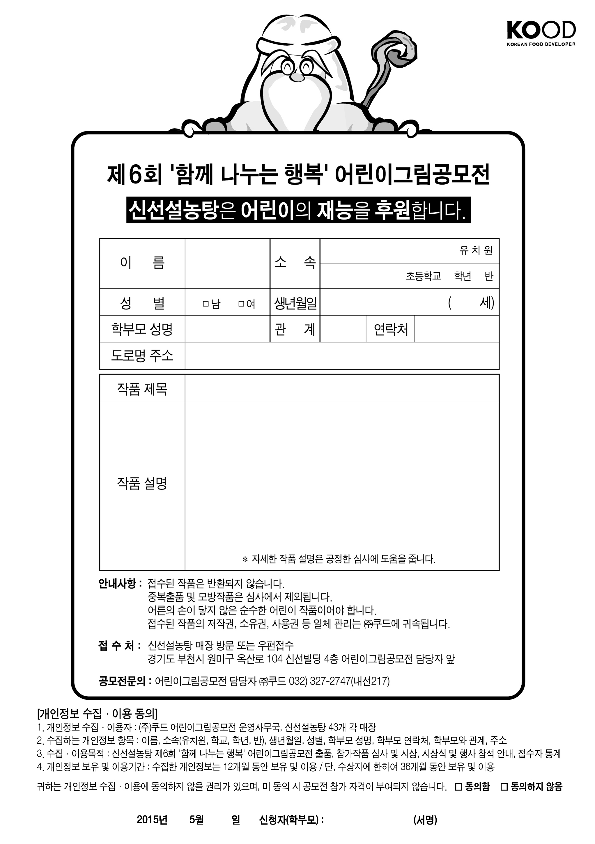 2015년 신선설농탕에서는 미술에 재능이 있는 어린이를 후원하고자 제6회 ' 함께 나누는 행복' 어린이그림공모전을 개최합니다. 자세한 사항은 아래를 참조하시어 학부모님과 어린이여러분의 많은 관심과 참여 부탁드립니다.