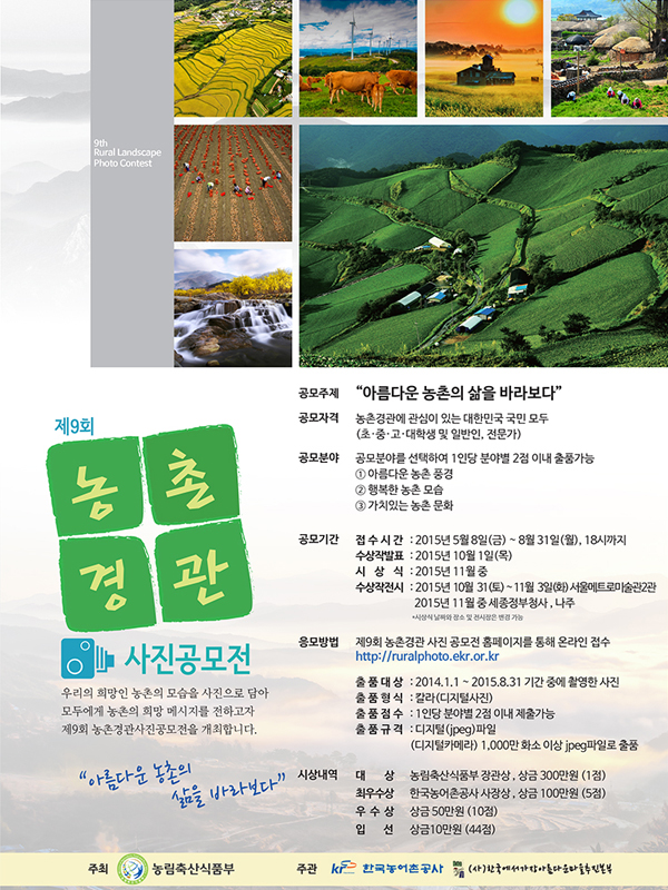 - 제9회 농촌경관사진 공모전 홈페이지 http://ruralphoto.ekr.or.kr 를 통한 온라인 접수