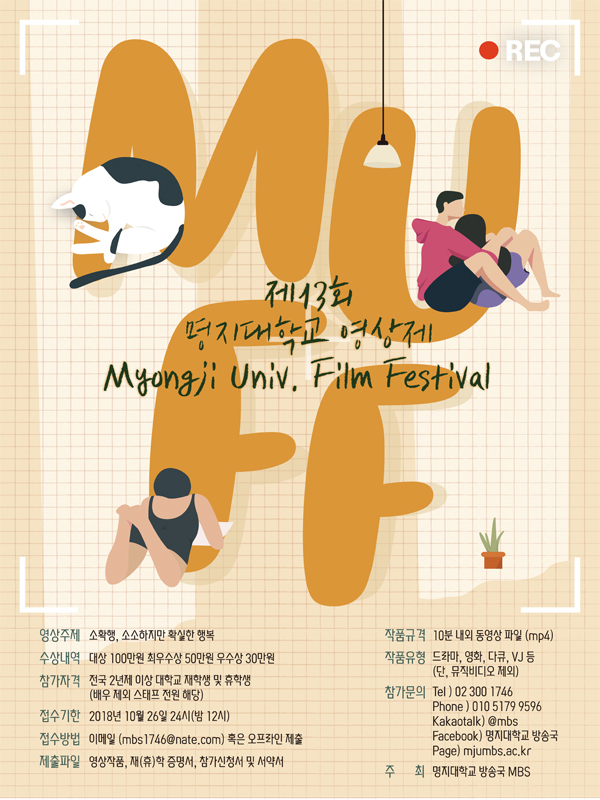 - 본 게시물에 첨부된 파일(참가신청서, 서약서)과 재(휴)학증명서, 그리고 참가하려는 본인의 영상작품을, 이메일 (mbs1746@nate.com)로 온라인 제출해주시거나 명지대학교 방송국으로 오프라인 제출해주시면 됩니다!