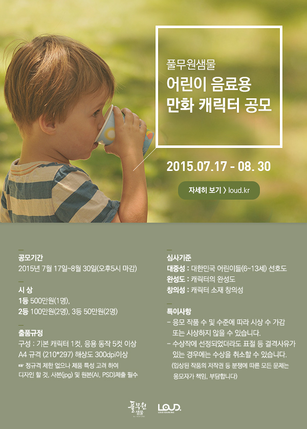 - 풀무원 샘물에서 어린이 음료용 만화 캐릭터 공모전을 실시합니다.