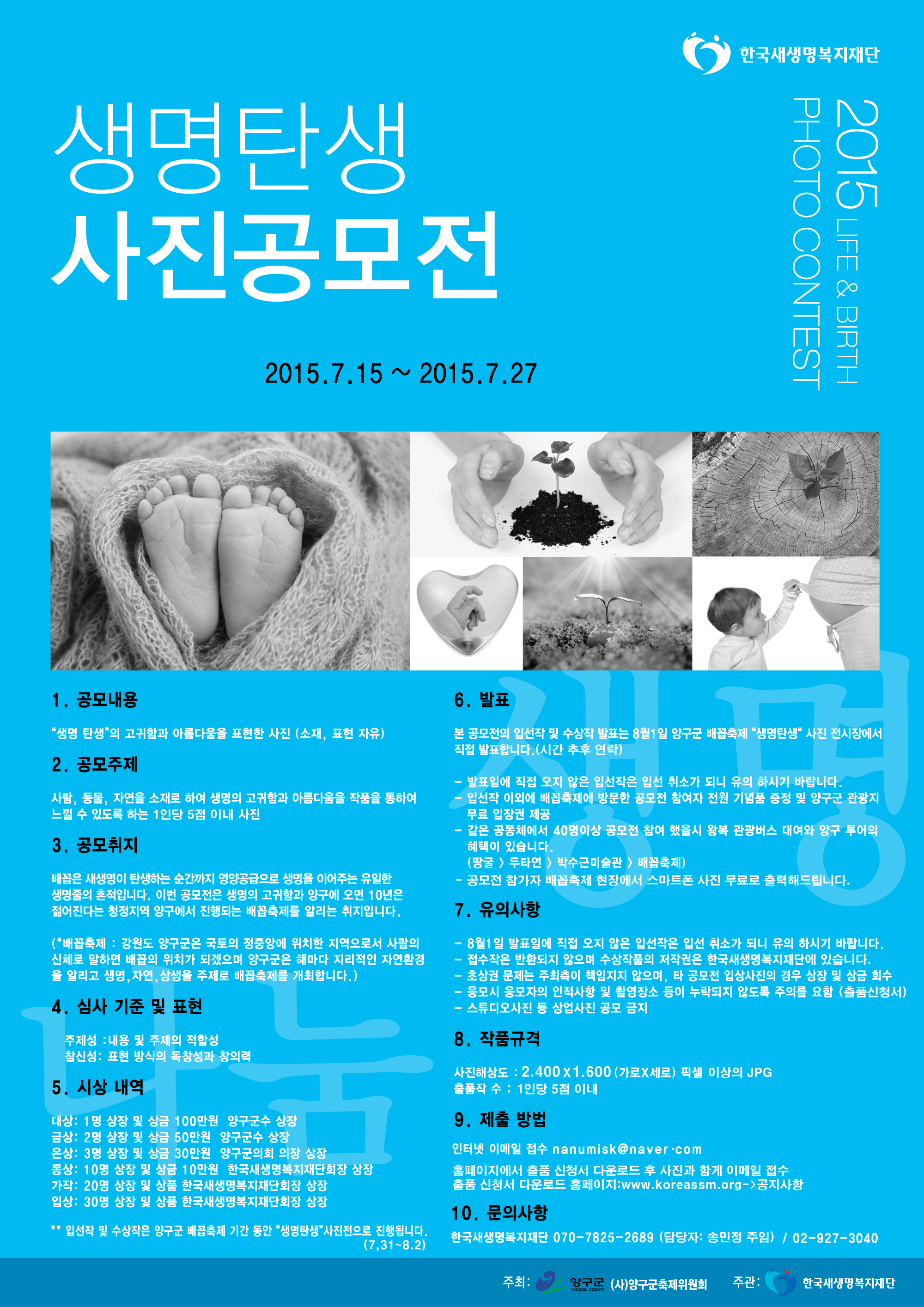 * 입선작 및 수상작은 양구군 배꼽축제 기간(7.31~8.2) 동안 “생명탄생”사진전으로 진행됩니다.