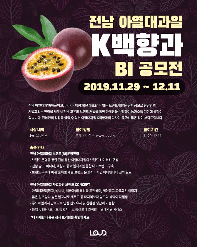 전남 아열대과일(애플망고, 바나나, 백향과)을 대표할 수 있는 브랜드개발을 위한 공모로 전남만의 차별화되는 전략을 세워서 전남 고유의 브랜드 개발을 통한 마케팅을 수행하여 농가소득 기여에 목적이 있습니다. 전남만의 장점을 살릴 수 있는 아열대과일 K백향과의 디자인 공모에 많은 참여 부탁드립니다.