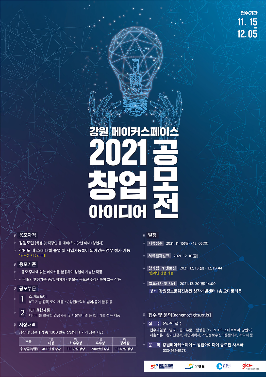 - 강원도내 소재 대학 졸업 및 사업자 등록이 되어 있는 경우 참가 가능