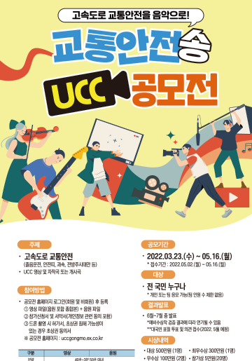 - 고속도로 교통안전 관련 참신한 아이디어의 콘텐츠를 모집하여 비영리‧공익적 목적의 다양한 홍보 활동에 활용하고자 함