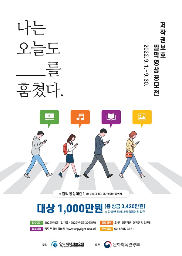 - 예술과 디지털 기술 등을 자유롭게 접목하되, 저작권 보호 또는 침해 예방을 주제로 한 영상 스토리텔링 콘텐츠 (브이로그, 애니메이션, 광고, 다큐 등 장르 자유) - 해상도 : 1280*720px 이상 *가로 또는 세로(숏폼) 영상 - 용량 : 300MB 이내 - 파일형식 : wmv, mp4, avi - 영상길이 : 60초 이내 ※ 수상작은 추후 원본 파일 제출 ※ 추후 수상작은 활용을 위해 재가공을 요청할 수 있음  |