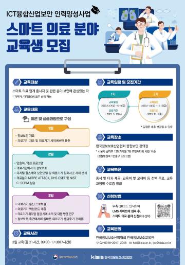[KISIA] 2023년도 ICT융합산업보안 인력양성사업 스마트 의료 분야(1차) 교육생 모집(~5/10)