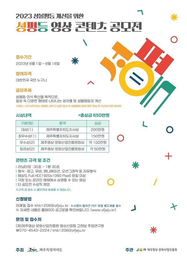 공모전 관련 문의사항은 문의처(070-4543-2224) 또는 이메일(khb1208@ofjeju.kr)로 문의해주십시오.