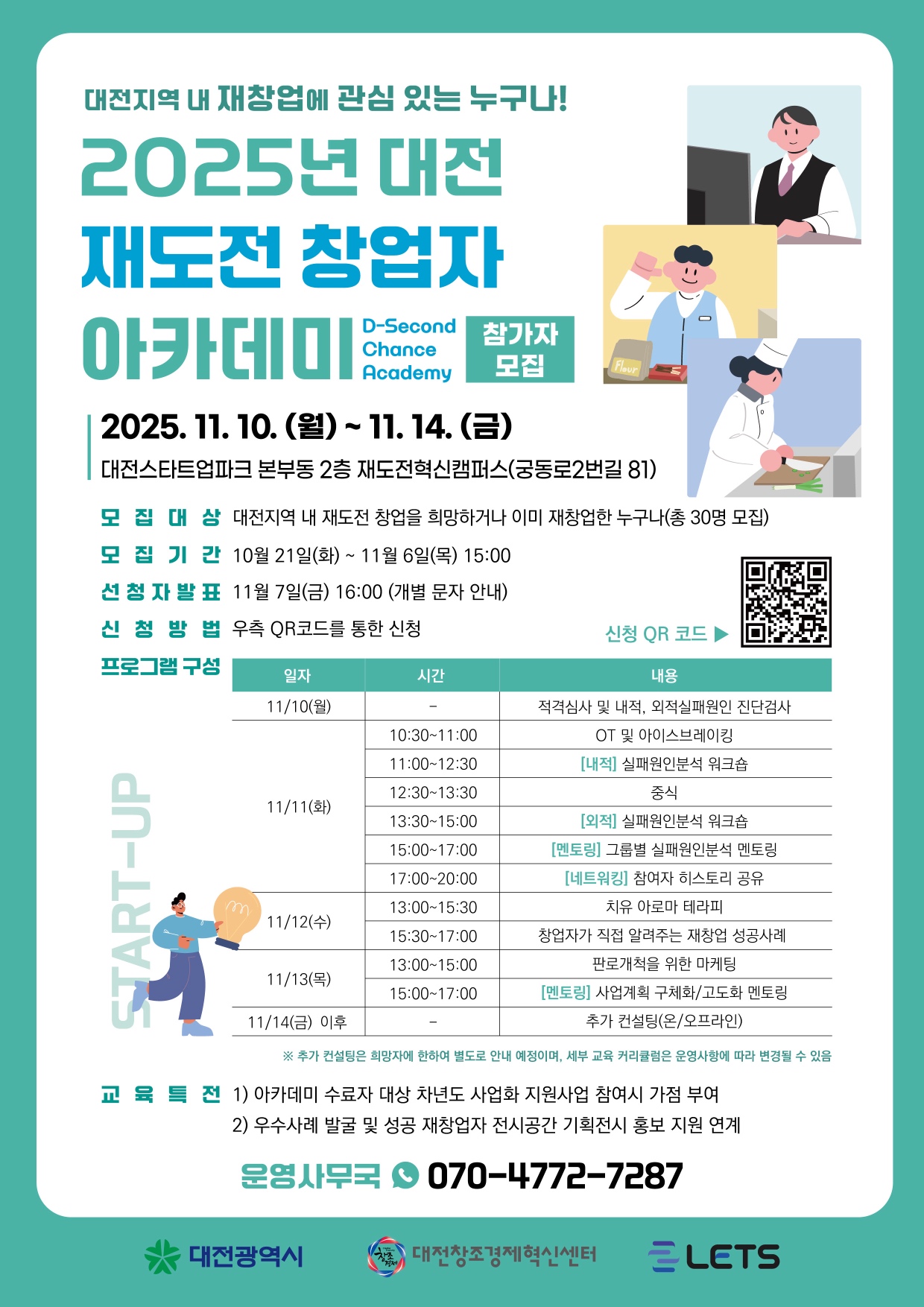 - 대전지역 내 재도전 창업을 희망하거나 이미 재창업한 누구나(총 30명 모집)