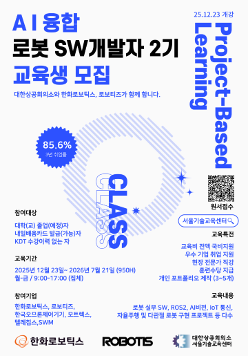 AI융합 로봇 SW개발자 2기 교육생 모집 안내 대한상공회의소와 한화로보틱스, 로보티즈가 함께하는 로봇 SW개발자 양성 과정입니다. (전액 국비지원 교육)로봇 실무 SW, ROS2, AI비전, IoT 통신, 자율주행 및 다관절 로봇 구현 프로젝트 등으로 이루어져 채용연계까지 지원되는 훈련과정입니다.