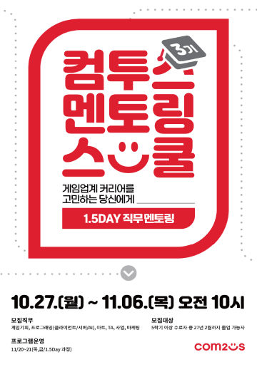 컴투스 멘토링 스쿨은 게임업계에 관심은 있지만 나에게 맞는 직무가 고민인 분들을 위해 준비한 컴투스만의 특별한 멘토링 프로그램입니다. 개발, 사업 등 게임업계의 다양한 직무의 현직자 특강과 그룹 멘토링을 통해 나에게 적합한 직무도 찾아보고, 내년 취업활동을 위한 꿀팁을 단 이틀만에 모두 챙겨가세요!
