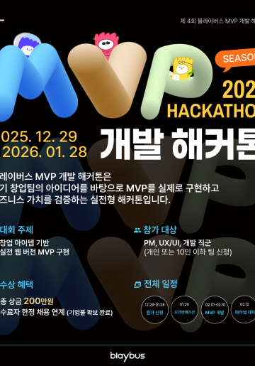 블레이버스 MVP 개발 해커톤은초기 창업팀의 아이디어를 바탕으로 MVP를 실제로 구현하고비즈니스 가치를 검증하는 실전형 해커톤입니다.