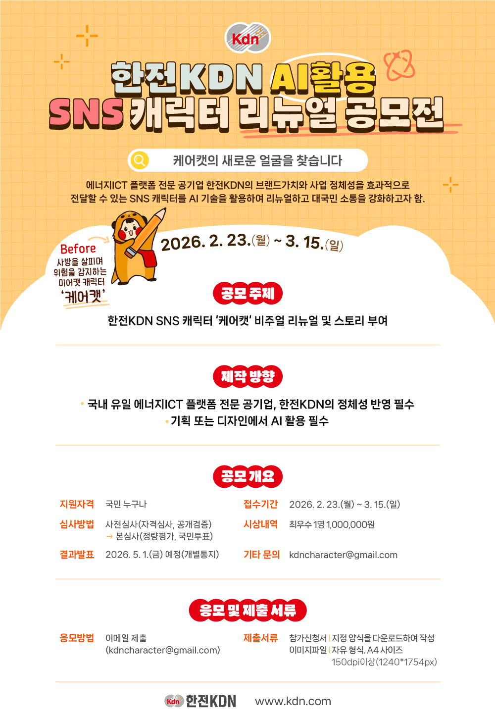 Q4. 기존 ‘케어캣’캐릭터는 어떻게 리뉴얼해야 하나요?A. 기존 캐릭터의 미어캣 소재는 유지하되, 디자인 측면에서 리뉴얼된 모습이 명확히 드러나야 하며, 세계관이 추가되어야 합니다. 디자인이 효과적으로 업그레이드되어 창의성과 심미성이 뛰어나게 표현되고, 한전KDN의 정체성이 세계관에 잘 녹아든 작품은 심사 시 높은 평가를 받을 수 있습니다.