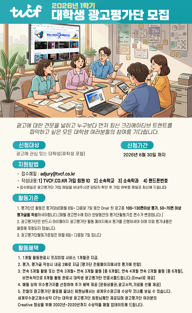 2. 광고평가단은 반드시 'tvcf.co.kr > 마이페이지 > 광고평가단 활동 페이지' 에서 평가를진행하셔야 하며 이외 평가 내용은 활동에 포함되지 않습니다.