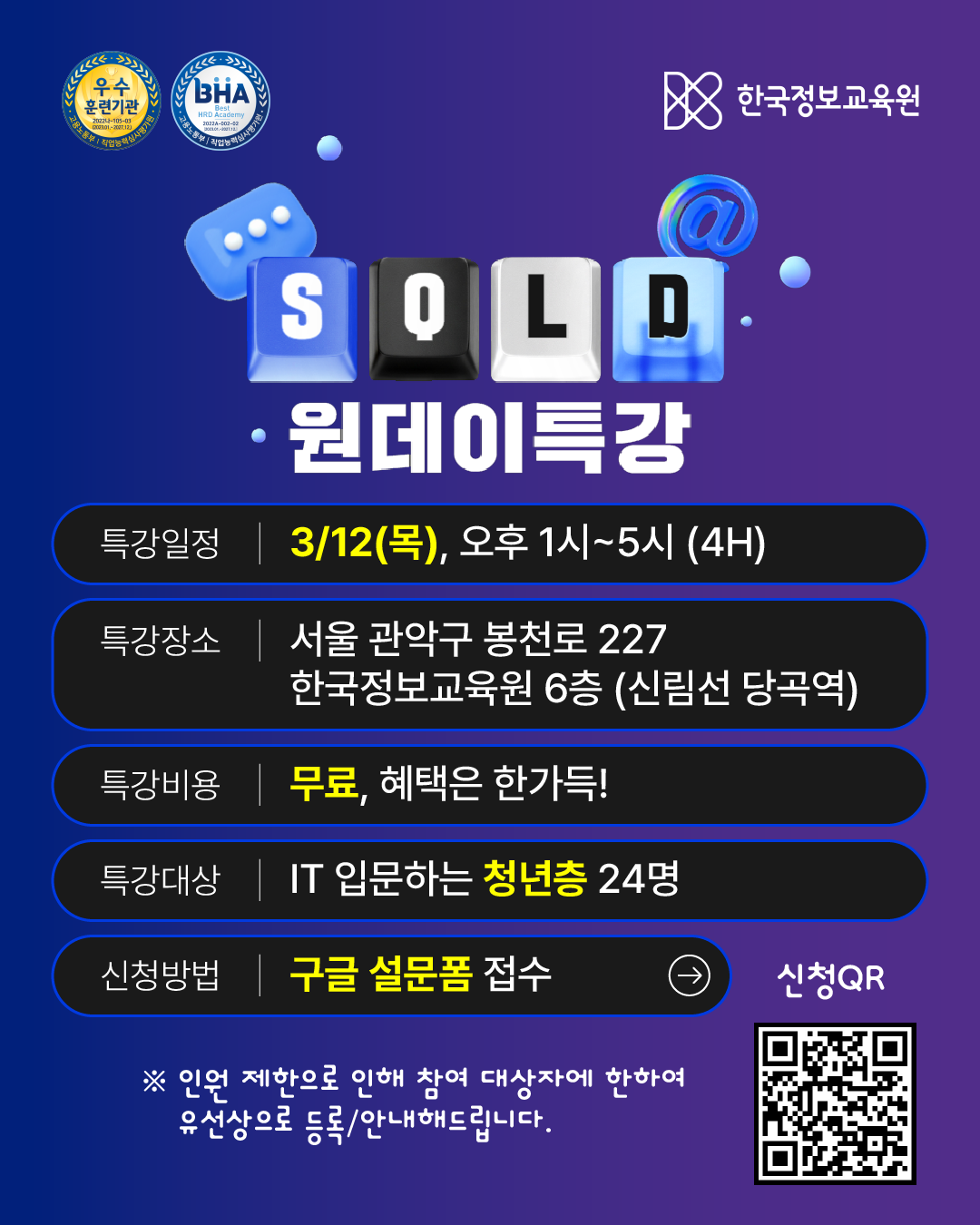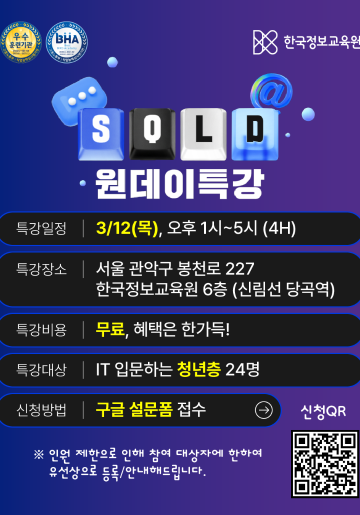 장소: 서울시 관악구 봉천로 227, 6층 한국정보교육원 (신림선 당곡역 2번출구)