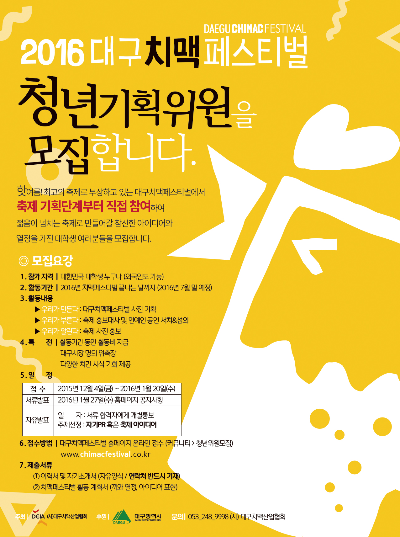 - 대구치맥페스티벌 홈페이지 온라인 접수 www.chimacfestival.co.kr (커뮤니티 > 청년위원모집)