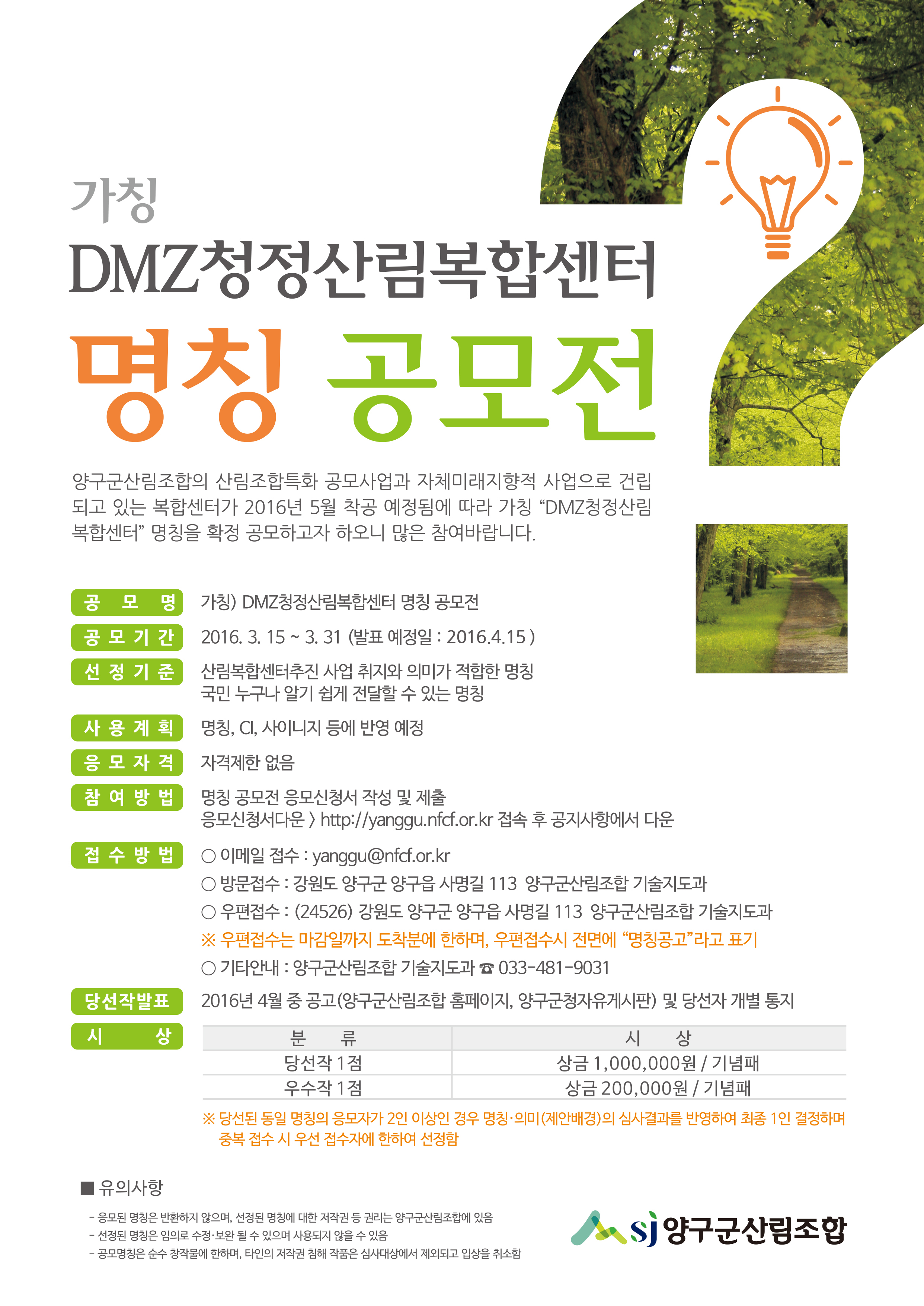 - 응모된 명칭은 반환하지 않으며, 선정된 명칭에 대한 저작권 등 권리는 양구군산림조합에 있음