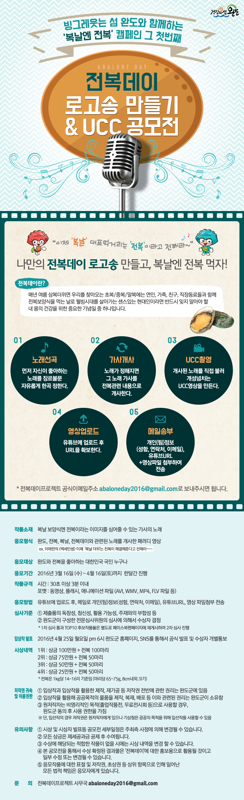 * 전복데이프로젝트 공식이메일주소 abaloneday2016@gmail.com로 보내주시면 됩니다