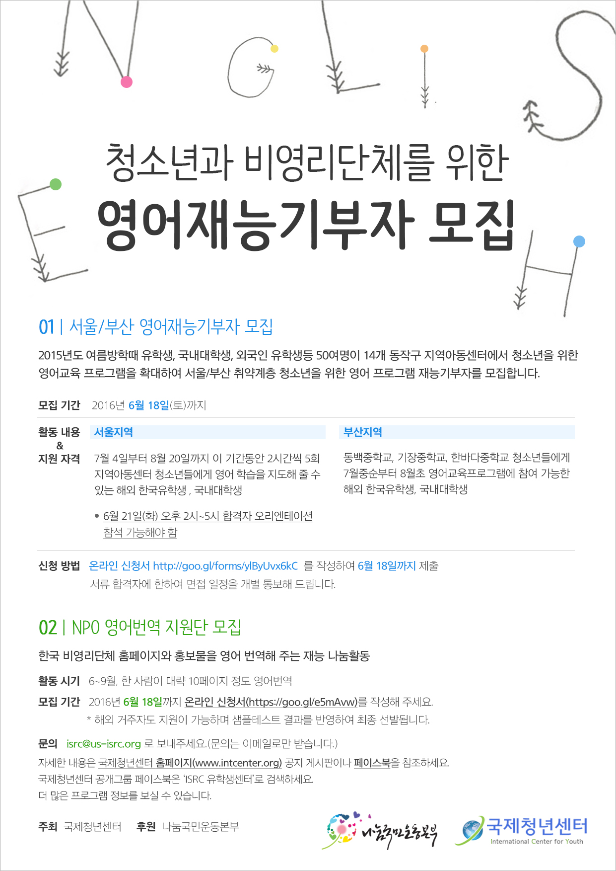 - 청소년 영어 재능기부 : http://goo.gl/forms/ylByUvx6kC - NPO영어번역지원단 ㅣ https://goo.gl/e5mAvw 다양한 다른 프로그램은 국제청년센터 홈페이지 (http://www.us-isrc.org/notice ) 참조하세요.