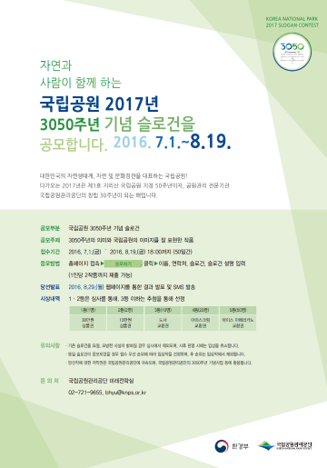 - 당선작에 대한 저작권은 국립공원관리공단에 귀속되며, 국립공원관리공단의 3050주년 기념사업 등에 활용됩니다.