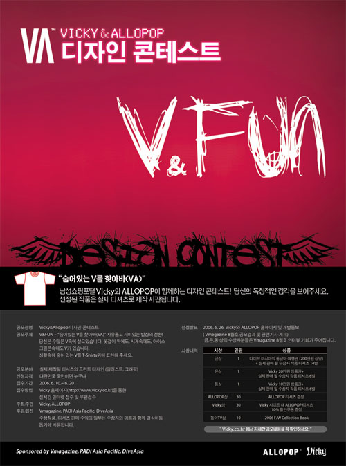 V magazine & ALLOPOP 공동 진행 디자인 공모전 -------------------------------------------------------------------- 1. 응모개요 V & A 티셔츠공모전은 자신의 작품을 티셔츠로 표현하는 공모전입니다. 국내•기성•신인 등 제한없이 자신의 작품을 출품할 수 있으며, 출품한 모든 작품중 금상/은상/동상을 선정하여 T셔츠제작 온라인 판매와 선정된 작품본인에게 오리지날 T셔츠를 보내드립니다. 2. 응모대상 대한민국 국민이면 누구나 참여 가능 (6월 10일 부터 응모가 가능합니다.) 3. 응모 주의사항 - 그래픽디자인/회화등 - 일러스트레이션,낙서등 순수 창작품(수작업/컴퓨터 그래픽 작업)저작권이 창작자 본인에게 있어야 함. - 사진 이미지 등 - 자신이 직접 찍은 사진(수동/디지털 카메라) 상업적으로 사용된(잡지사진도용) 사진이나 타인의 사진인 경우 불가. - 캐릭터/심볼/타이포디자인(문자디자인) - 모방이 심한 캐릭터 또는 외국의 작품을 이용한 심볼형식의 디자인 불가. 타이포(폰트) 디자인의 경우 저작권이 창작자 본인에게 있어야 함. - 타인의 저작권, 초상권을 침해하거나, 노골적으로 성적표현이 된 작품은 접수 할 수 없습니다. 4.티셔츠 디자인 컨셉 (concept) "V KOREA, 대한민국의 V" V KOREA - "열정, 젊음, 행복 그리고 승리! 자랑스러운 대한민국의 V를 표현 한다!" 당신은 수많은 V속에 살고 있습니다. 옷걸이 위에도, 시계속에도, 아이스크림콘속에도 V가 있습니다. V를 소재로 열정과 젊음으로 가득한 대한민국을 T-Shirts위에 표현해 주세요. 5. 응모형식/ *** 작품제출형식*** 먼저 사이트에서 VA.zip 파일과 응모양식.doc파일을 다운받습니다 ==>파일다운받기<== * 온라인과 오프라인 동시에 접수하셔야 응모가 됩니다. -일러스트 ai 로 작업할 경우 디자인 원본화일(일러스트.ai화일)과 디자인에 적용시킨 사진 jpg화일(VA.zip화일참조)과 함께 CD로 제출 하셔야 합니다. -포토샵 psd 로 작업할 경우 디자인 원본화일(포토샵.psd화일)과 디자인에 적용시킨 사진 jpg화일(VA.zip화일참조)과 함께 CD로 제출 하셔야 합니다. - 아래 5가지가 모두 포함 되어있어야 합니다. (CD레이블에 이름과 주민번호 앞번호를 꼭 기입해주시기 바랍니다.) 1-PSD,AI파일(원본) 2. T-SHIRTS_BLACK.PSD or T-SHIRTS_WHITE.PSD(모델적용 코디컷) 3. 2번파일의 jpg파일 4. 응모서류 doc파일 5. 칼라 프린트 2장 - 칼라 프린트 된 A4용지 첨부 (그래픽부분만 인쇄) - 작품 보낼 주소 : 서울특별시 강남구 삼성동 삼안빌딩 7층 담당 : 김도균 팀장. • 디자인 컬러수는 1~2도 입니다.(2가지 색을 쓸 수 있는 겁니다) • 화상 해상도- 250 dpi ~ 300dpi • 작품크기-최대 가로 32cm, 세로 46cm • 화상모드-CMYK • 보존 미디어-CD로만 접수를 받습니다. 유의사항 1.보존 CD에 라벨을 붙여, 이름과 작품 을 정확히 명기해 주세요. 2.출품양식을 다운받아 작품과 같이 CD에 같이 저장하고 응모서류 프린트를 1부해서 CD와 같이 보내주세요. 3.출품작품은 반환하지 않습니다.(본인의 작품을 공모전 이외의 용도로 사용하지 않습니다.) 4.E-mail 응모는 불가합니다. - 티셔츠 종류 및 사이즈 - 여성 - MS 사이즈(사이즈 스펙은 알루팝 제품 사이즈 참고) 남성 - L 사이즈 공모전에 사용 될 티셔츠의 원단칼라는 검정과 흰색 두가지 입니다. 티셔츠는 면20수~30수입니다. - 티셔츠에 나염 될 작품의 위치 - 1.작품은 T셔츠의 앞 가슴의 위치, 중앙에 나염 합니다. 뒷면은 V & A 로고가 목아래쪽으로 나염 됩니다. 2.작품은 작업해주신 실제 사이즈로만 나염을 합니다. 그러니 보내주실 때 정확한 나염 사이즈로 저장을 해주시기 바랍니다. - 프린트 색상 재현에 대해 - 작품은 나염 시스템으로 T셔츠에 직접 프린트 합니다. 염색물이므로, 원화와 색차이와 해상도 차이가 납니다. 사진은, 섬세한 부분의 재현성과 색조가 차이가 있습니다. 특히 컴퓨터상의 RGB와는 많은 차이가 있습니다. 프린트는 CMYK로 하기 때문에 원본보다 다소 어두워 질 수 있습니다. - 출품료/출품수 - 출품료는 없습니다.1인당 1작품만 접수 받습니다. 6.시상 - 금상 1명 다이브 아시아의 동남아 여행권+ 실제 판매 될 T-shirts로서 출품한 디자인 채택 본인작품 티셔츠 14벌(MS사이즈7벌,L사이즈7벌)증정 - 은상 1명 Vicky 20만원 상품권+ 출품한 디자인의 T-shirts 제작 본인작품 티셔츠 6벌(MS사이즈3벌,L사이즈3벌)증정 - 동상 1명 Vicky 10만원 상품권 + 출품한 디자인의 T-shirts 제작 본인작품 티셔츠 6벌(MS사이즈3벌,L사이즈3벌)증정 - 동아TV상 10명 2006 F/W Collection Book 증정 - Allopop상 30명 ALLOPOP 티셔츠 선물 티셔츠 증정 - V KOREA의 수상작품, 티셔츠 판매 수익의 일부는 수상자의 이름과 함께 결식 아동 돕기에 사용됩니다. - Vicky상 30명 Vicky 사이트 ALLOPOP 티셔츠 10% 할인쿠폰 증정 - 심사방법 - ALLOPOP 에서 티셔츠에 적합하며 완성도 높은 디자인을 심사. - 응모마감 - 2006년 6월 10일 ~ 2003년 6월 20일까지(오전 우편접수에 한함.) - 발표 - 2003년 6월 26일 온라인 Vicky 사이트와 ALLOPOP 사이트 를 통하여 발표. - 문의 - 이메일 문의만 받습니다. Berny0103@itline.co.kr