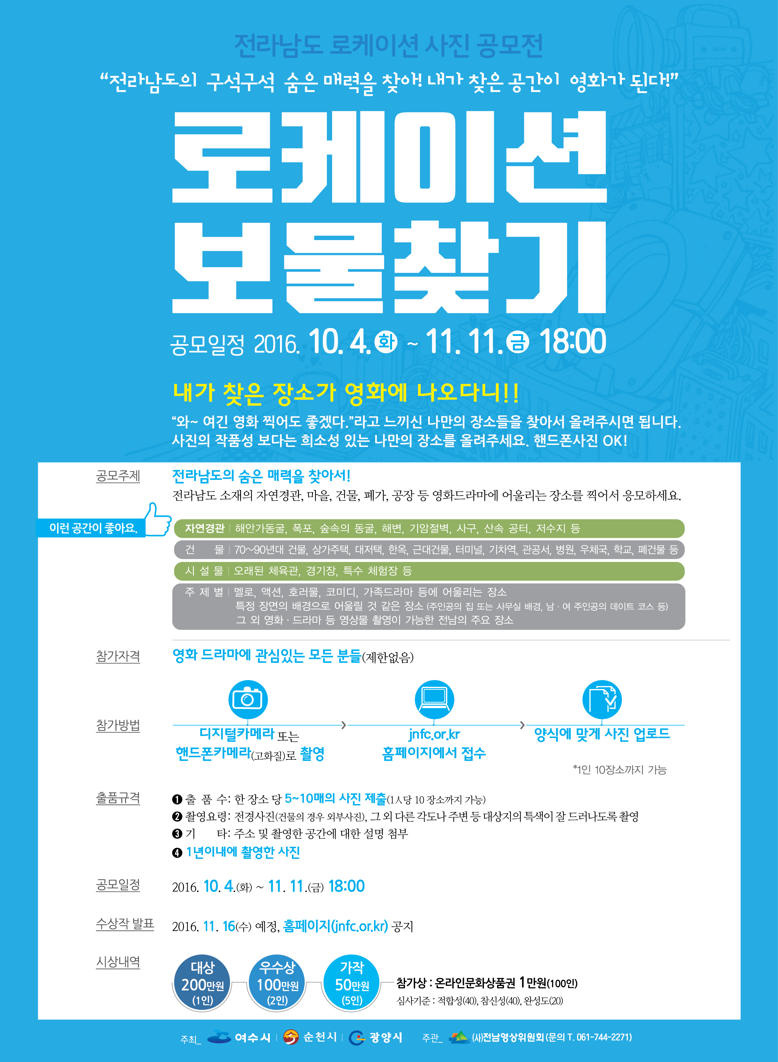 - 전라남도 소재의 자연경관, 마을, 건물, 폐가, 공장 등 영화드라마에 어울리는 장소를 찍어서 응모하세요.
