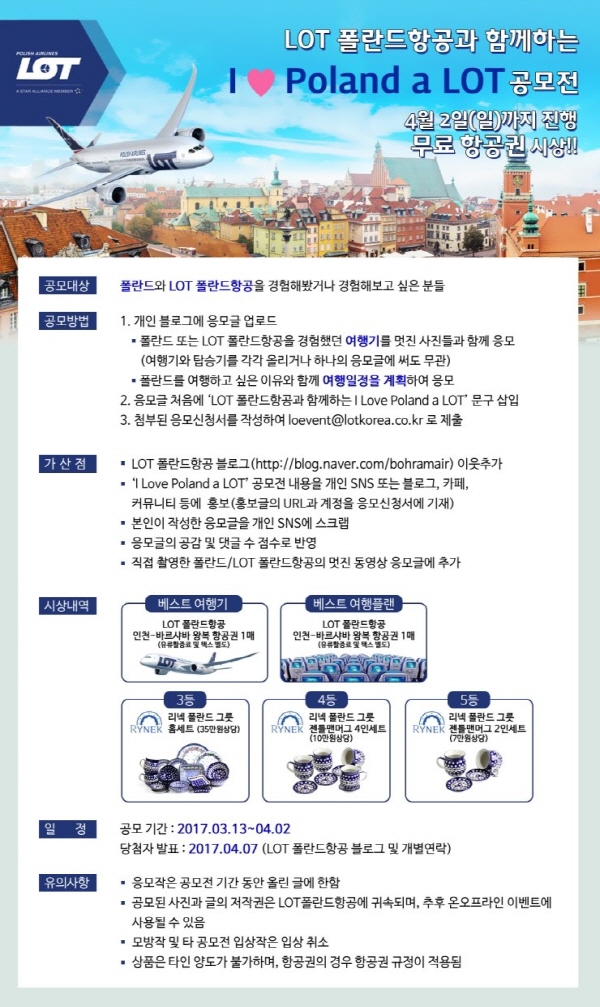 - 당첨자 발표 : 2017년 4월 7일 (LOT 폴란드항공 블로그 : http://blog.naver.com/bohramair)
