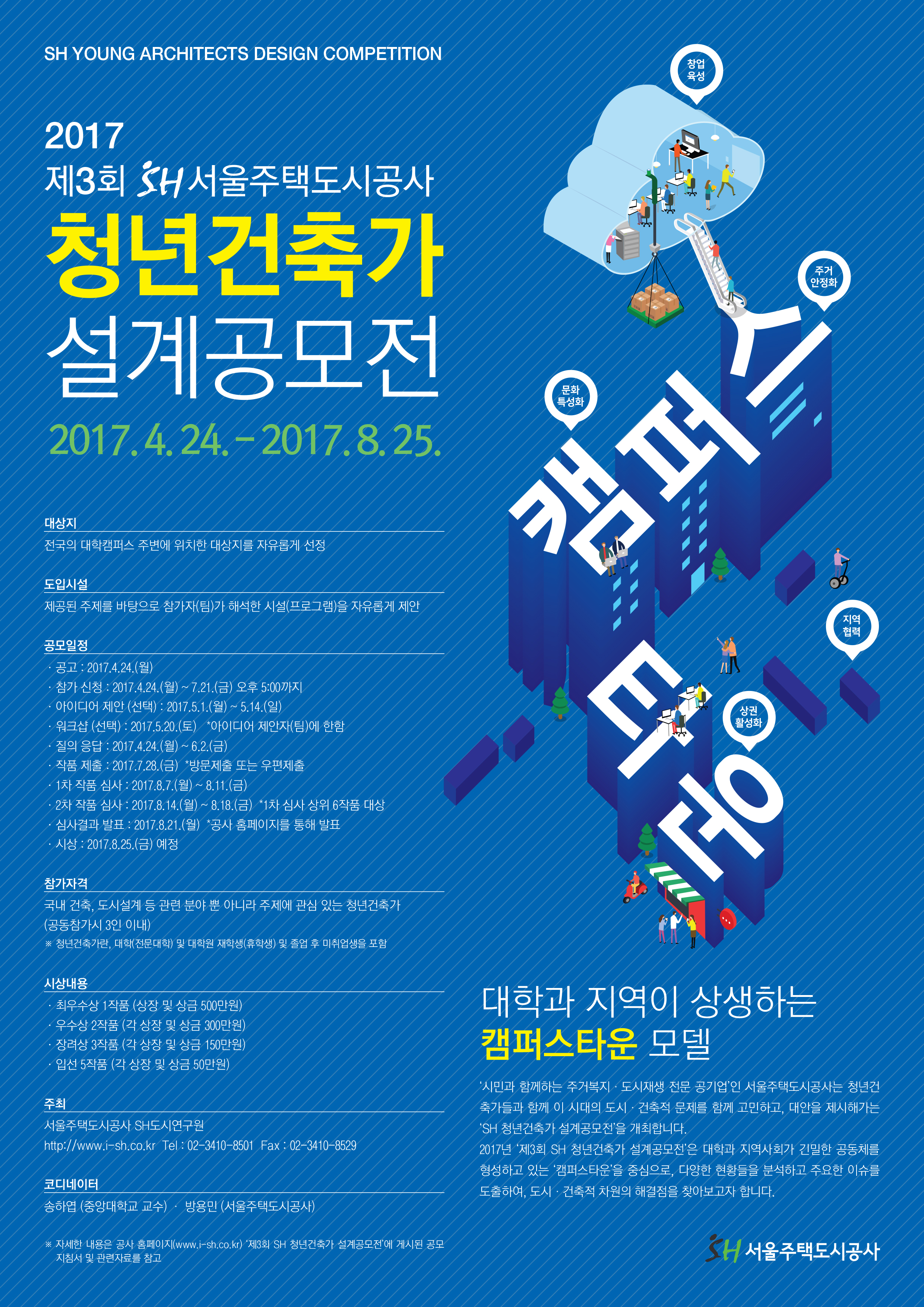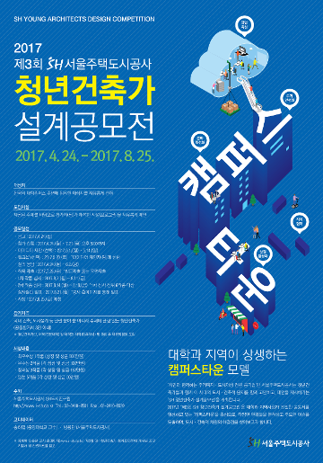 - 2017년 ‘제3회 SH 청년건축가 설계공모전’은 대학과 지역사회가 긴밀한 공동체를 형성하고 있는 캠퍼스타운’을 중심으로, 다양한 현황들을 분석하고 주요한 이슈를 도출하여, 도시·건축적 차원의 해결점을 찾아보고자 합니다.