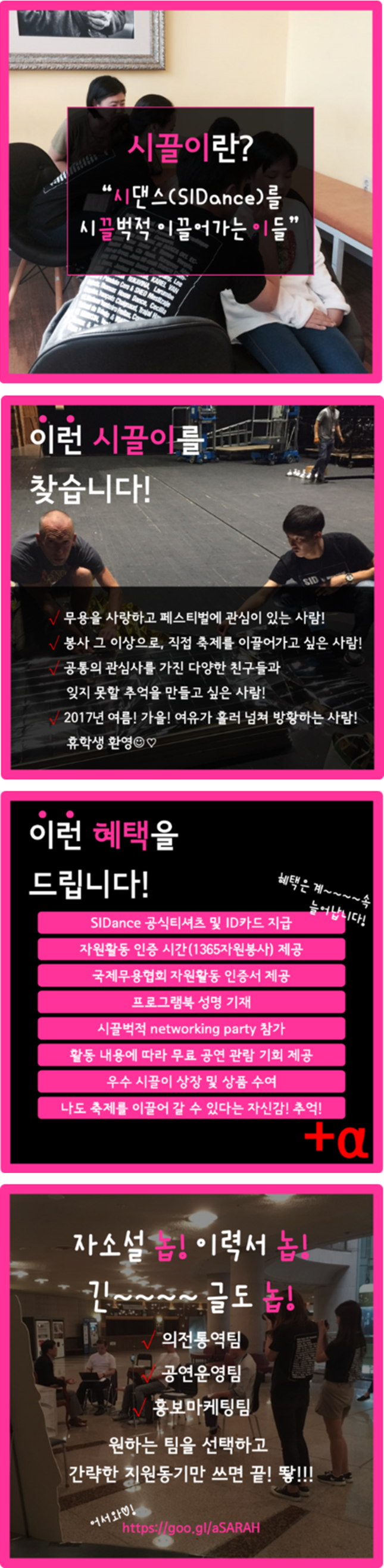 - 축제 전부터 현장까지 내 손으로 직접 축제를 만들어 보자! 시댄스를 보다 더 가까이! 더 신나게! 즐기고 싶은 열정적인 사람 손! 고민하지 말고 지금 바로 지원 고고!