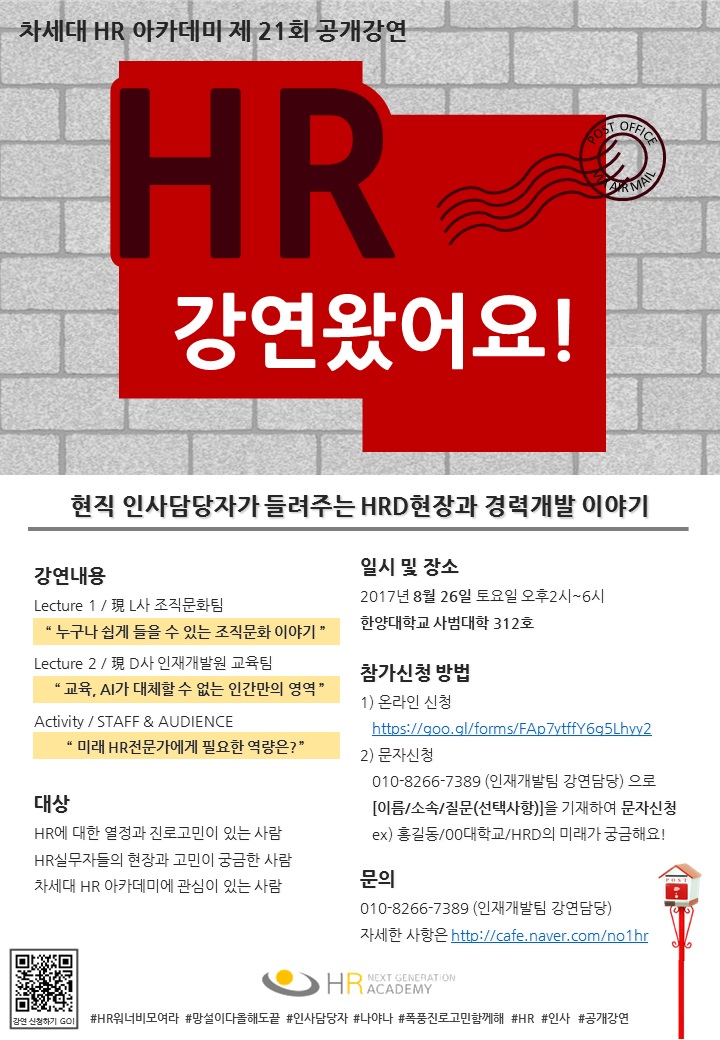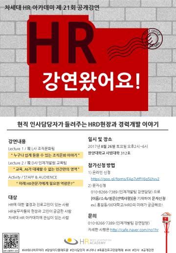 [ 차세대 HR 아카데미] 제 21회 공개강연 개최 진심이 담긴 인사전문가를 꿈꾸는 사람들의 모임 ‘차세대 HR 아카데미’ 에서 제 21회 공개강연을 개최합니다.