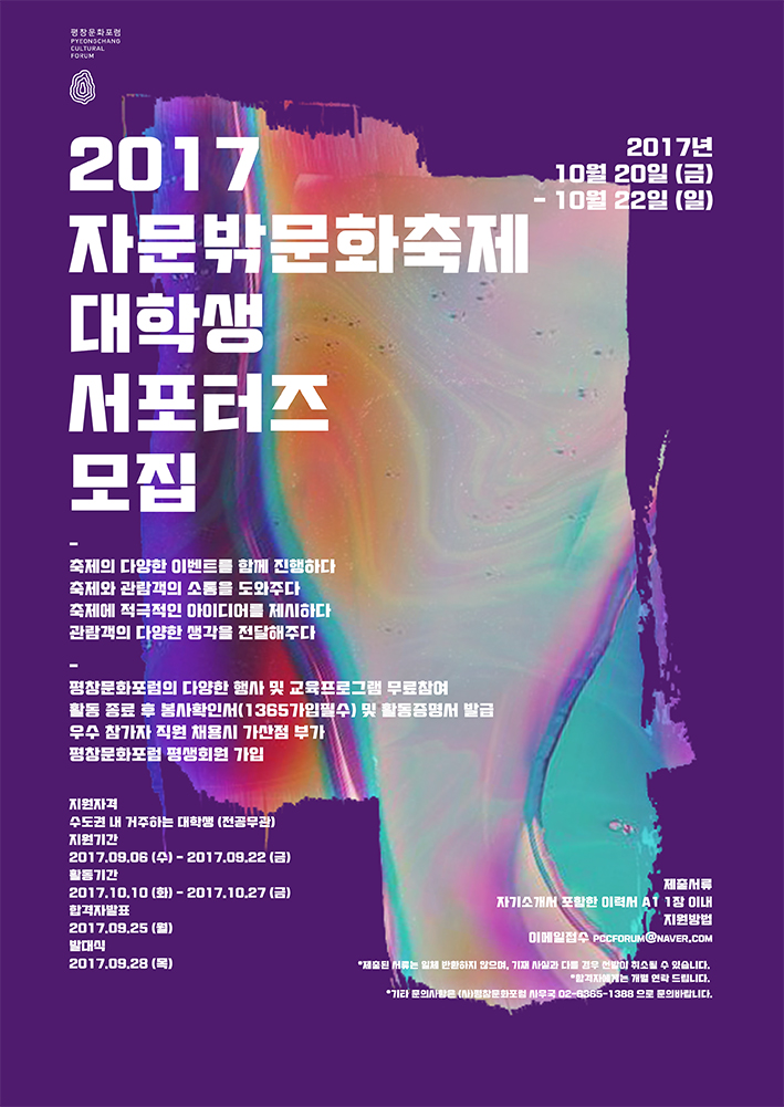 안녕하세요, 제 5회 자문밖문화축제를 주최하고 있는 자문밖문화포럼 사무국입니다. 자문밖문화포럼에서는 자문밖문화축제를 함께 만들어갈 분들을 찾고 있습니다. 자문밖문화포럼은 자문밖지역(구기동, 부암동, 신영동, 평창동, 홍지동)의 특성을 살려 예술, 자연, 삶이 통합되는 행동한 창의마을을 만들기 위해 주민참여형 예술, 지역과 주민이 주체가 되는 지속가능한 예술마을, 자연과 역사가 어우러진 창의 예술마을을 지향하고 있습니다. 자문밖문화축제는 이러한 창의예술마을을 만들어가는 데 있어서 가장 핵심적인 행사로, 지역예술가의 스튜디오 및 하우스에 방문하는 오픈스튜디오, 지역주민전시, 교육프로그램 등과 같은 다양한 프로그램을 진행하고 있습니다. 이러한 자문밖문화축제의 기획, 진행, 홍보 등을 도와주실 서포터즈를 모집합니다.