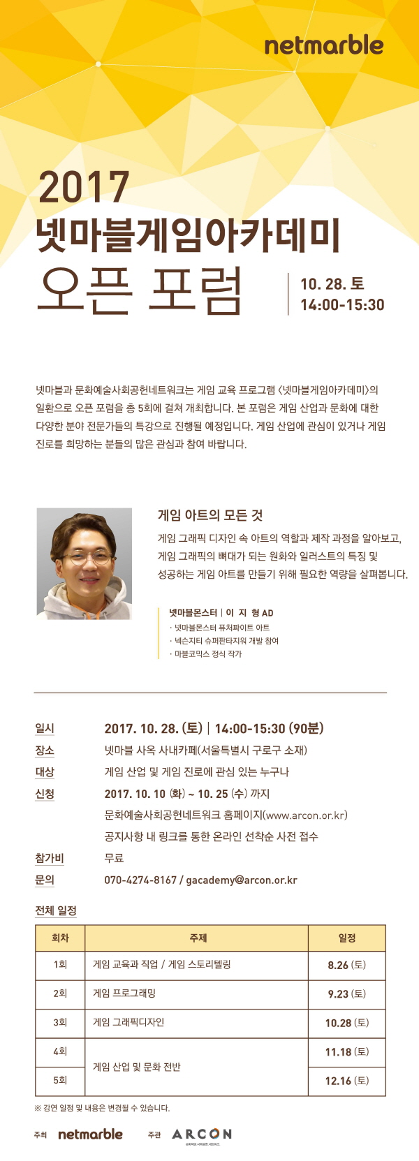 넷마블과 ARCON은 게임 교육 프로그램 <넷마블게임아카데미>의 일환으로 오픈 포럼을 총 5회에 걸쳐 개최합니다. 본 포럼은 게임 산업과 문화에 대한 다양한 분야 전문가들의 특강으로 진행될 예정입니다. 게임 산업에 관심이 있거나 게임 진로를 희망하는 분들의 많은 관심과 참여 바랍니다.