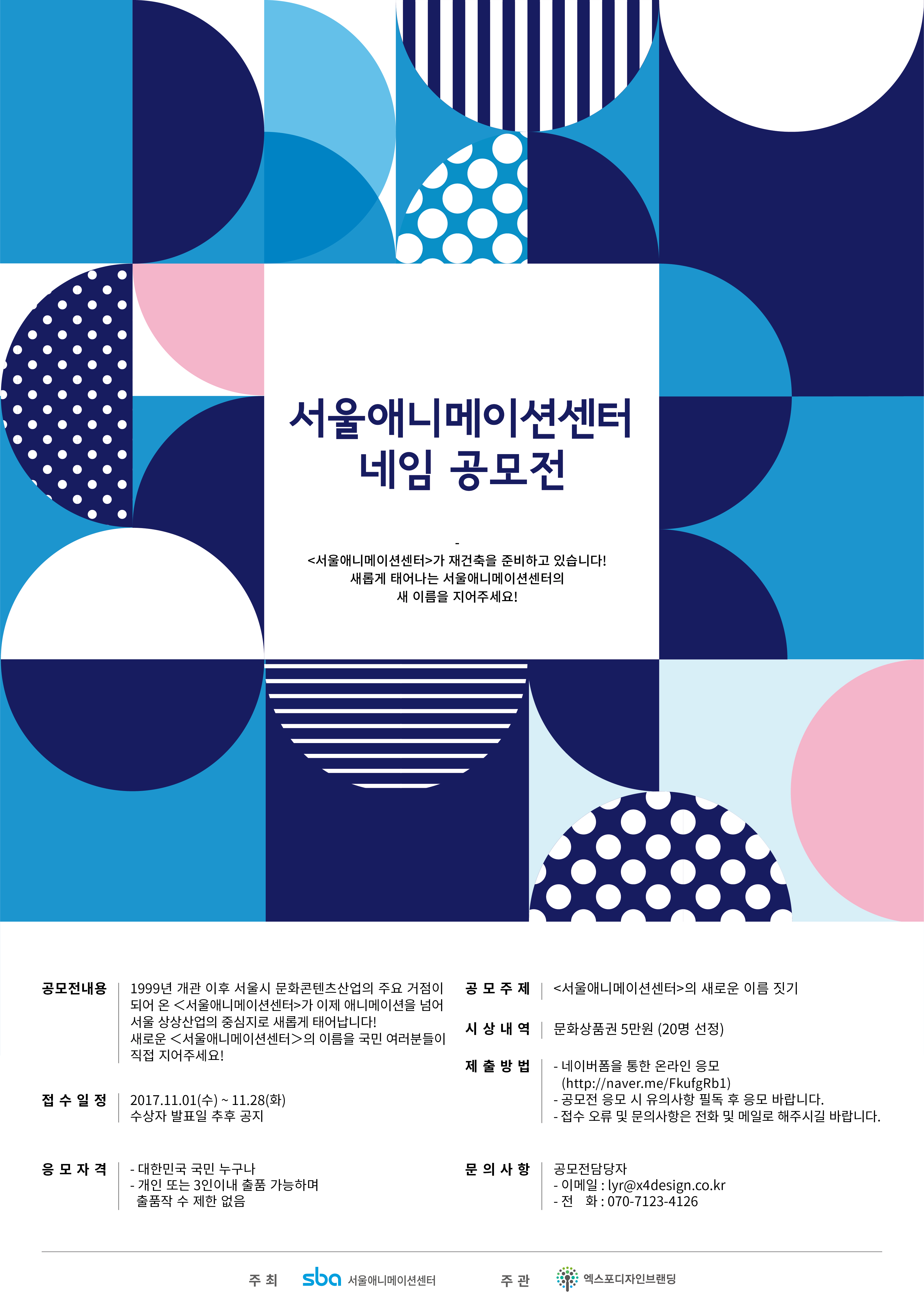 <서울애니메이션센터>가 재건축을 준비하고 있습니다, 새롭게 태어나는 서울애니메이션센터의 새 이름을 지어주세요! [ 공모전 내용 ] 1999년 개관한 이후 서울시 문화콘텐츠산업의 주요 거점이 되어 온 <서울애니메이션센터>가 이제 애니메이션을 넘어 서울 상상산업의 중심지로 새롭게 태어납니다! 새로운 서울애니메이션센터>의 이름을 국민 여러분들이 직접 지어주세요!