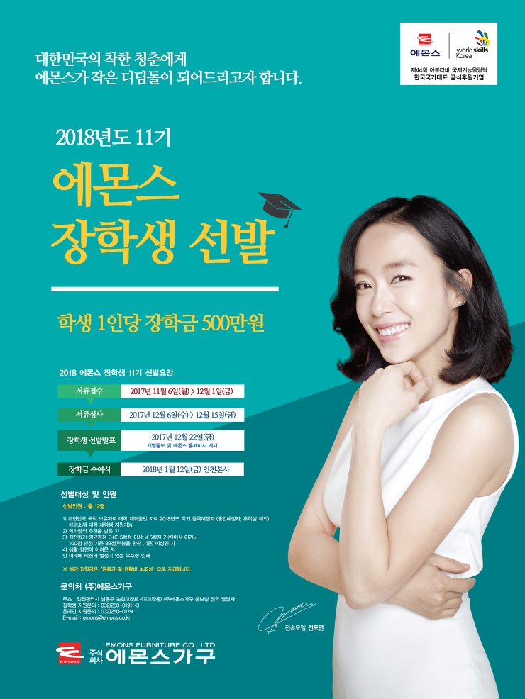 - 첨부 서류 접수처 : 21689 인천광역시 남동구 논현고잔로 47 (고잔동) (주)에몬스가구 홍보실 장학 담당자