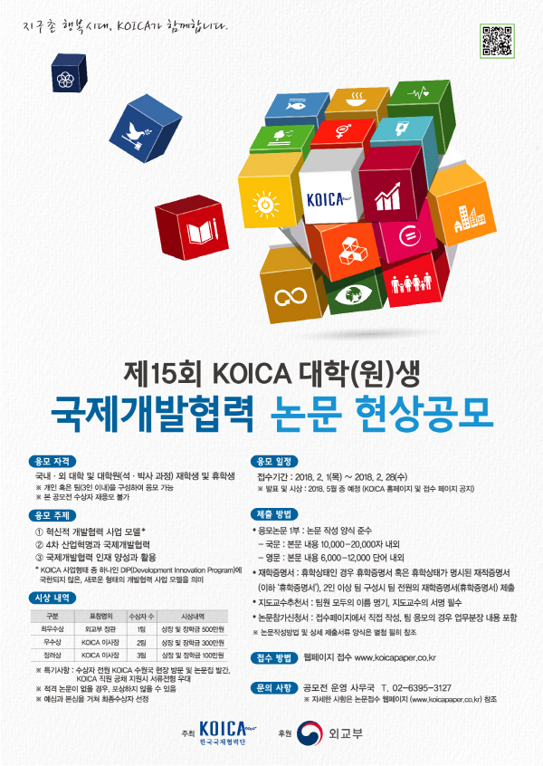 - 발표 및 시상 : 2018. 5월 중 예정(KOICA홈페이지 및 접수 페이지 공지)