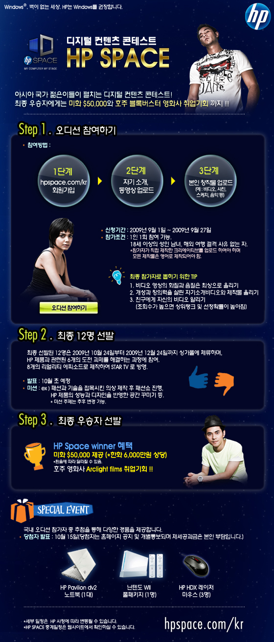 hp space 란 대한민국, 중국, 인도 싱가포르 등 아시아 11개 국가의 젊은이들이 팀을 이뤄 제작한 컨텐츠를 하지고 경쟁하는 리얼리티 쇼 형식의콘테스트입니다.