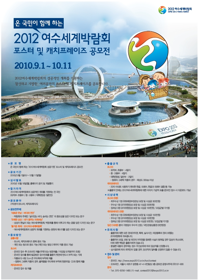 | ◎ 공모명 온 국민이 함께 하는‘2012여수세계박람회 성공기원’포스터 및 캐치프레이즈 공모전 ◎ 공모 기간 2010년 9월 1일(수)~10월 11일(월) ◎ 심사 발표 2010년 10월 18일(월), 홈페이지 공지 및 개별통지 ◎ 참가 자격 2012여수세계박람회의 성공적인 개최를 기원하는 전 국민 (유치부·초등부 / 중·고등부 / 대학(원)생·일반인) ◎ 공모 분야 2개 분야 (포스터, 캐치프레이즈) ◎ 공모전 주제 ‘새로운 만남 : 바다와 연안’ ·박람회의 주제인‘살아있는 바다, 숨쉬는 연안’의 중요성을 담은 디자인 또는 문구 ‘유쾌한 상상 : 내가 꿈꾸는 미래세상’ ·상상이 현실이 되는 여수세계박람회, 박람회를 통해 이루고자 하는 꿈을 담은 디자인 또는 문구 ‘즐거운 축제 : 2012여수세계박람회’ ·여수세계박람회의 성공적 개최를 기원하는 응원의 메시지를 담은 디자인 또는 문구 ◎ 응모 방안 공통사항 ·포스터, 캐치프레이즈 중복 응모 가능 ·개인 또는 팀으로 응모 가능 (개인 또는 팀당 2개까지 작품 응모 가능) 포스터 ·온라인 접수 후 오프라인 제출 (우편 또는 방문제출 / 마감일 도착분까지 유효) ·온라인 접수를 통해 발급받은 접수번호를 출품작 뒷면에 반드시 부착 또는 기재 ·작품보다 사방 2cm 큰 우드락에 부착해 제출 - 컴퓨터 그래픽 작품의 경우, 출력물을 우드락에 부착해 원본파일 CD와 함께 제출 캐치프레이즈 ·온라인 접수 및 제출 ◎ 출품 규격 포스터 ·유치부, 초등부 : 4절지 ·중·고등부 : 4절지 ·대학(원)생, 일반부 : 2절지 - 컴퓨터 그래픽 작품의 경우 : 해상도 300dpi 이상 캐치프레이즈 ·20자 이내로 사용하기 편리한 한글, 외래어, 한글과 외래어 결합 등 가능 ※출품작 안에는 2012여수세계박람회에 대한 이미지 가급적 표출 (온라인 접수 시 다운로드 가능) ◎ 시상 내역 포스터 (5명) ·최우수상 1명 (국토해양부장관상 표창 및 시상금 300만원) ·우수상 1명 (조직위원장상 표창 및 시상금 200만원) ·장려상 3명 (조직위원장상 표창 및 시상금 100만원 / 모집군별 각1명) 캐치프레이즈 (5명) ·최우수상 1명 (국토해양부장관상 표창 및 시상금 150만원) ·우수상 1명 (조직위원장상 표창 및 시상금 100만원) ·장려상 3명 (조직위원장상 표창 및 시상금 50만원 / 모집군별 각1명) 입선 (100명) 분야 구분없이 우수작 선정 / 국민관광상품권 (5만원권) ◎ 유의 사항 ·출품작에 대한 모든 권리(저작권, 특허, 실사시안, 의장등록의 권리 포함)는 조직위원회에 귀속됩니다. ·출품작이 표절, 모방 및 타인의 저작권을 침해한 사실이 밝혀질 경우 입상이 취소되며, 이에 대한 책임은 출품자에게 있습니다. ·동일한 내용의 경우에는 접수 우선순위에 따라 입상작을 선정합니다. ·심사결과에 따라 최적안이 없을 경우, 당선작의 일부를 선정하지 않을 수 있습니다. ◎ 접수 및 문의 접수 ·온라인 . http://www.expo2012.or.kr/kor/contest ·오프라인 . 서울시 서초구 잠원동 47-4 샤인빌딩 3층 공모전 운영사무국 (우)137-906 문의 ·Tel . 070 - 8256 -1480 / E - mail . contest2012@expo2012.or.kr